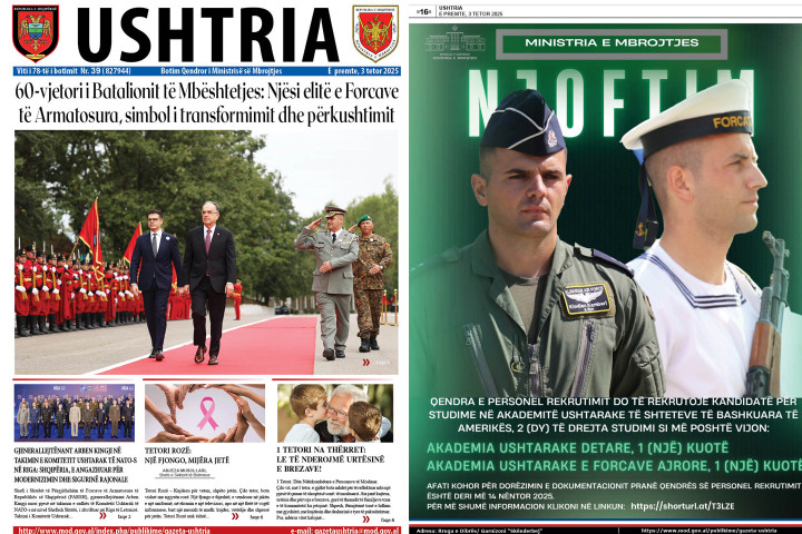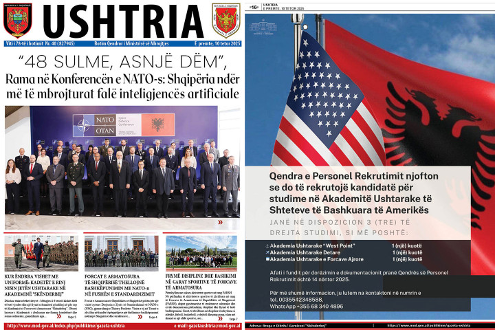 Gazeta Ushtria 10 tetor 2025 Lexo më shumë... Gazeta Ushtria 03 tetor 2025 Lexo më shumë... Gazeta Ushtria 26 shtator 2025 Lexo më shumë... Gazeta Ushtria 19 shtator 2025 Lexo më shumë... Fillimi Para 1 2 3 4 5 6 7 8 9 10 Tjetër Fundi Artikuj nga Newsroom Ministri Vengu në Qendrën e Inovacionit të Sigurisë dhe Mbrojtjes: Inovacioni, në qendër të transformimit të mbrojtjes e mërkurë, 15 tetor 2025 Zëvendësministrja e Mbrojtjes, znj. Blerina Abrazhda, mori pjesë në Ministerialin e Ministrave të Mbrojtjes të NATO-s, që u zhvillua sot në Bruksel e mërkurë, 15 tetor 2025 Ministri Vengu përuron godinën e rindërtuar të Qendrës së Personelit të Rekrutimit e martë, 14 tetor 2025 AKMC në Ditën Ndërkombëtare për Reduktimin e Riskut nga Fatkeqësitë, aktivitet ndërgjegjësues mbi parandalimim, përgatitjen dhe reagimin e koordinuar ndaj rreziqeve natyrore dhe emergjencave e martë, 14 tetor 2025 Ministri Vengu, në Konferencën e Mbrojtjes Kibernetike të NATO-s: Shqipëria do të rrisë investimet në këtë fushë për sigurinë e Aleancës e premte, 10 tetor 2025 Vizita e drejtorit të Zyrës së Standardizimit të NATO në Shqipëri - Forcim i bashkëpunimit në fushën e standardizimit ushtarak e enjte, 09 tetor 2025 Të gjitha nga Newsroom